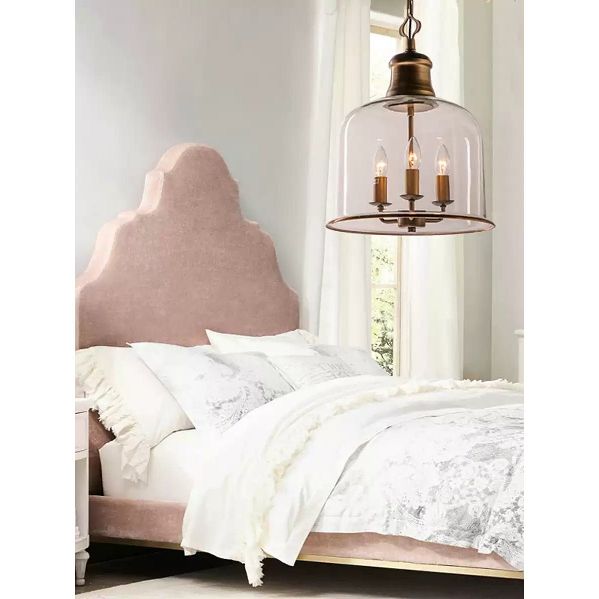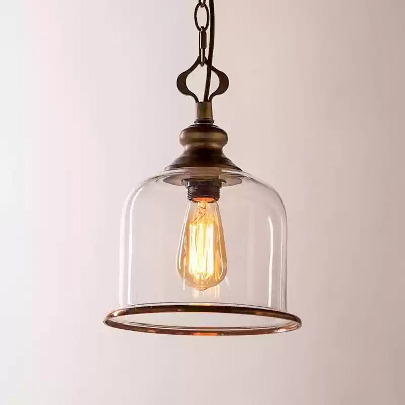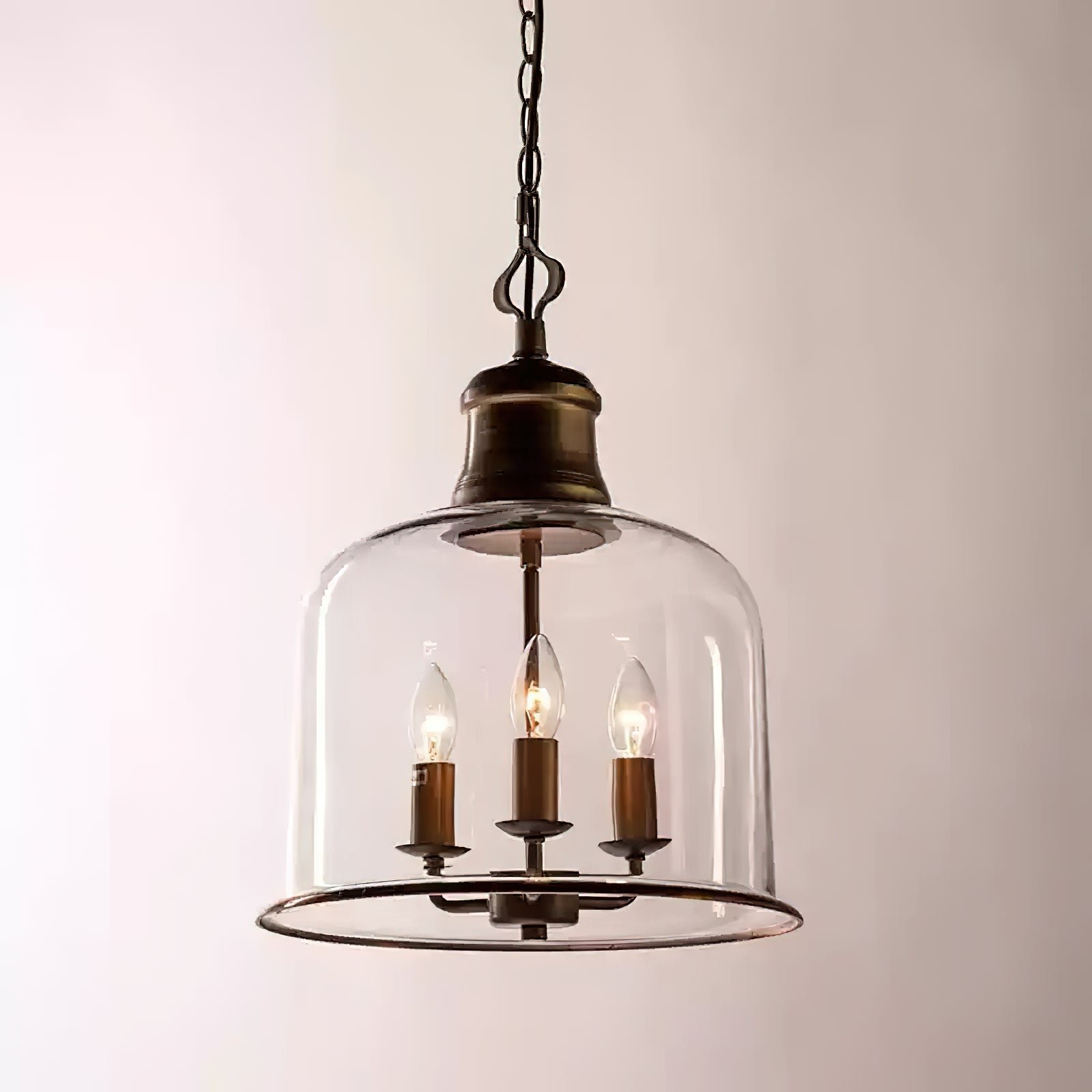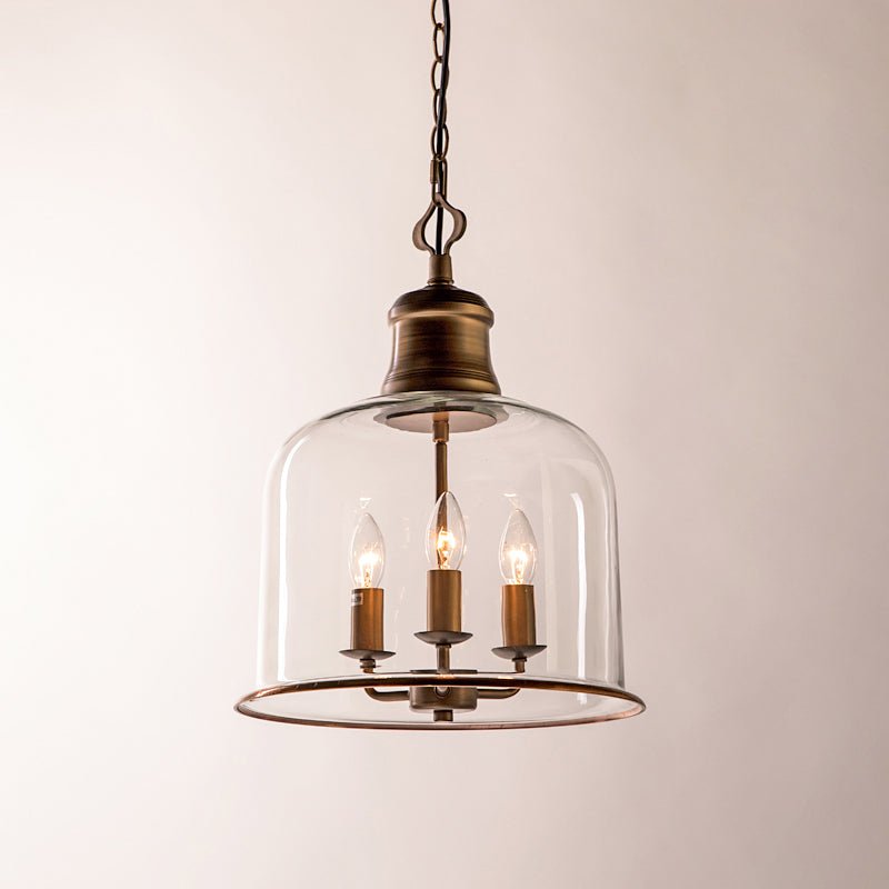 This ornate, bell-shaped glass lantern features a copper frame for a traditional look. Available in two sizes, the clear glass shade reduces glare while serving as a decorative focal point. The hinged bottom frame provides a unique design element and allows for easy access to the light source.