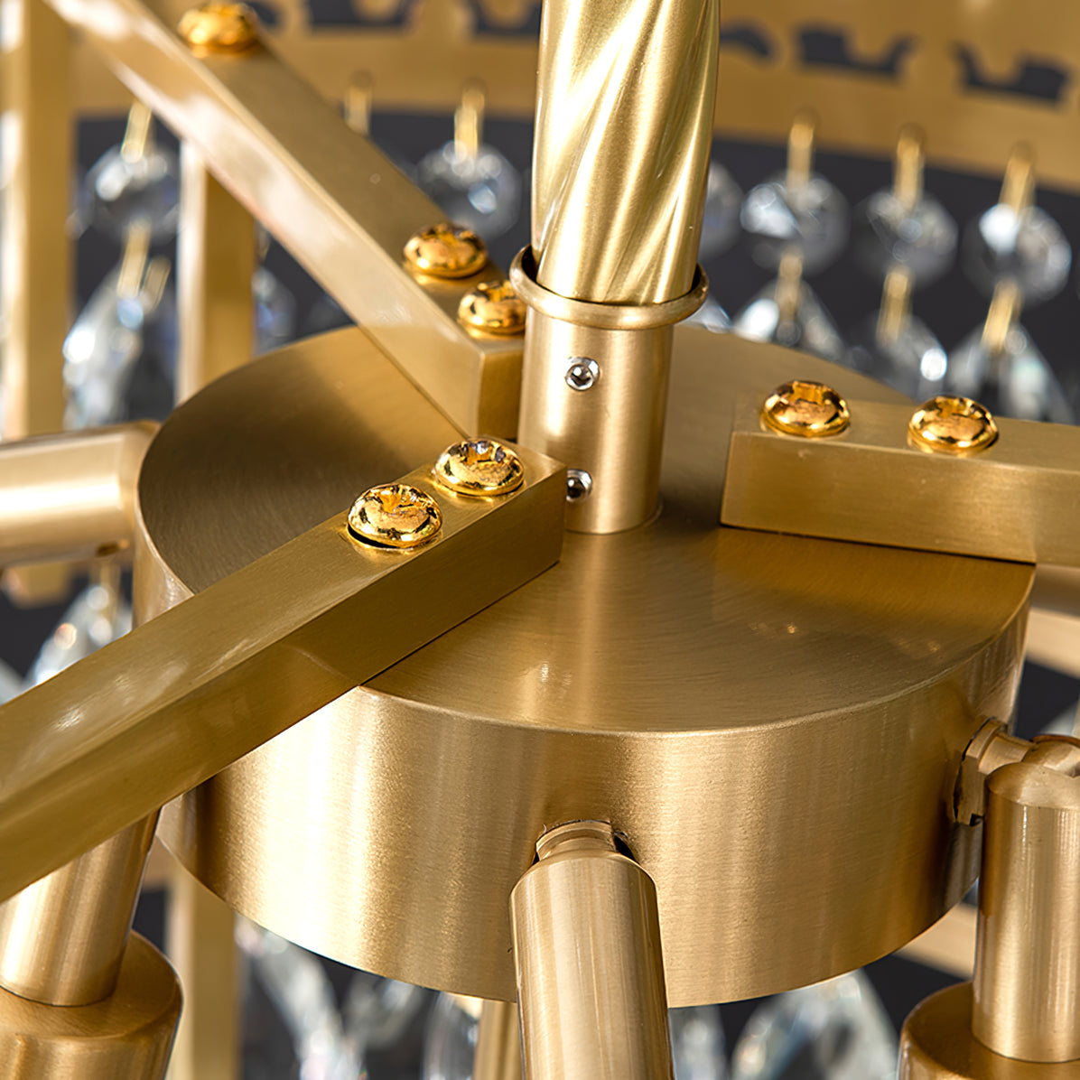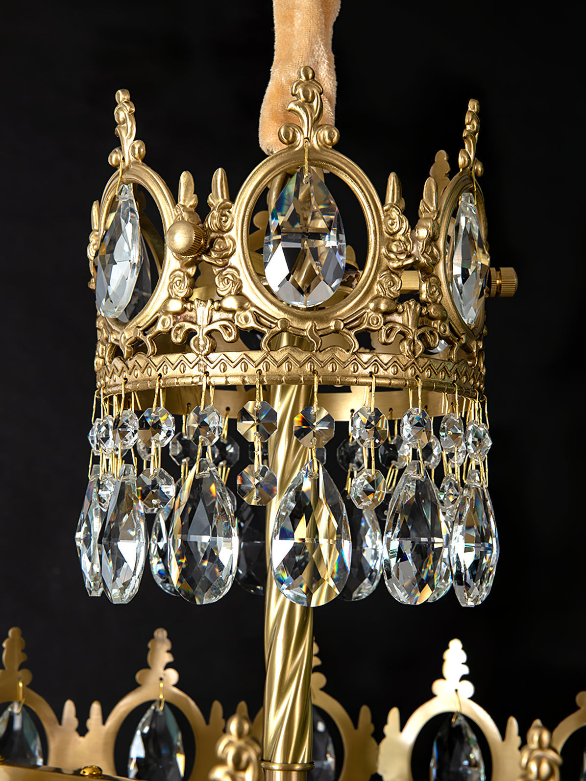 This elegant, vintage crystal chandelier is meticulously handmade with a solid structure and adorned with high-lead vintage crystal droplets. Originating from the late 1950s, this ceiling chandelier has been professionally re-wired, and its light bulb sockets have been updated to ensure full operational capacity. All original components of the chandelier have been preserved, with any broken crystals carefully replaced with period-appropriate vintage crystal droplets, maintaining its authentic character and aesthetic.