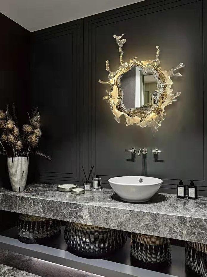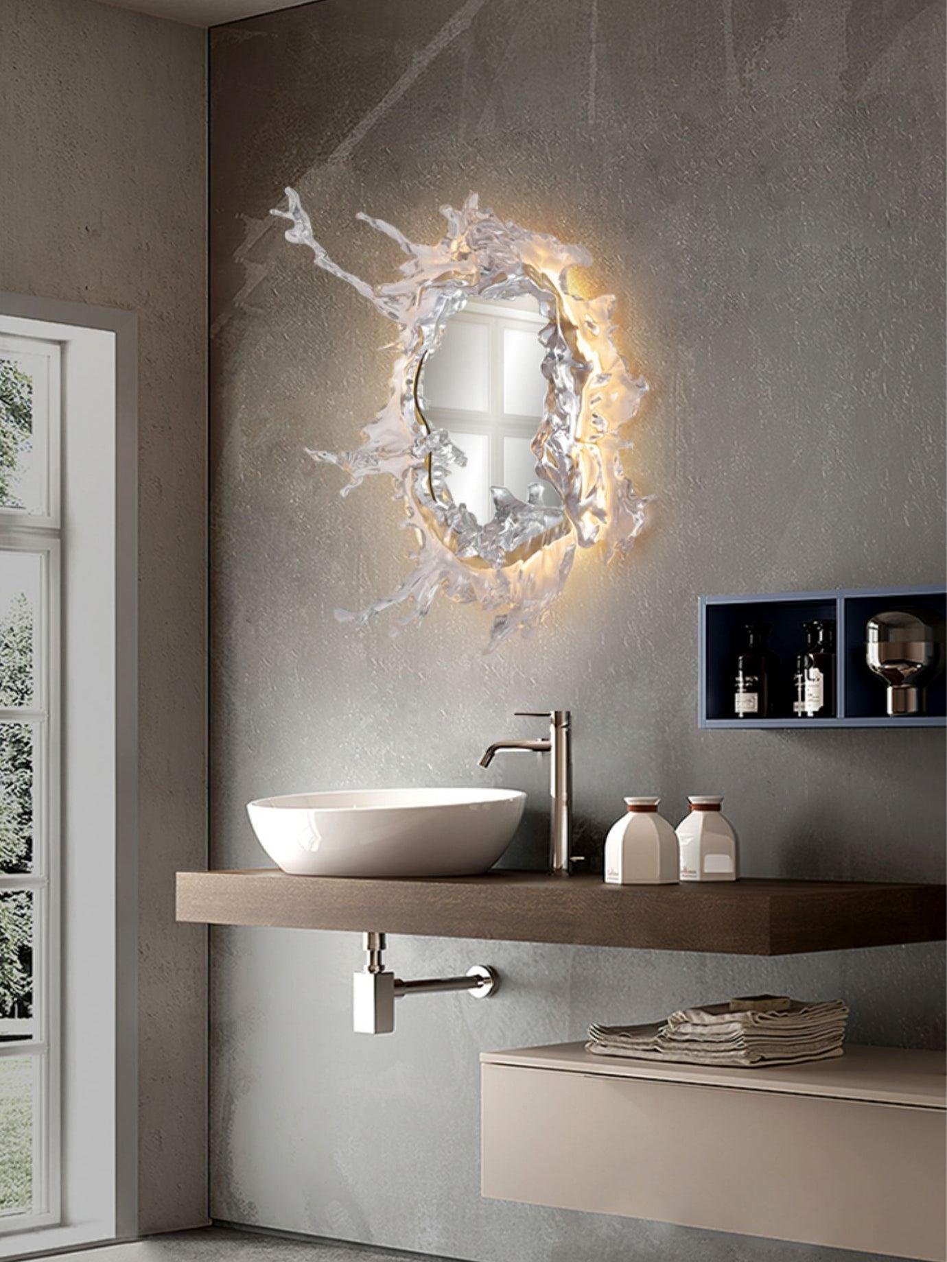 The Water Drop Mirror Wall Lamp presents a modern design aesthetic. It features intricate glass mirror detailing, designed to create an optical illusion of water droplets. This sleek wall-mounted fixture serves as a distinctive decorative and functional lighting element for contemporary interiors.