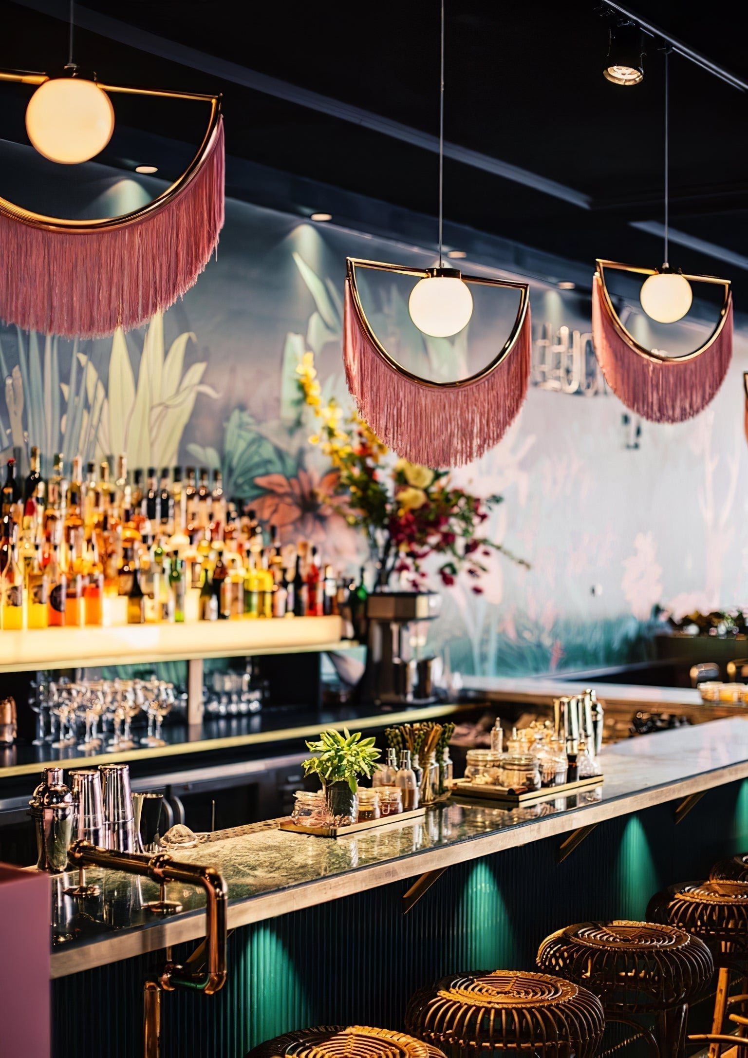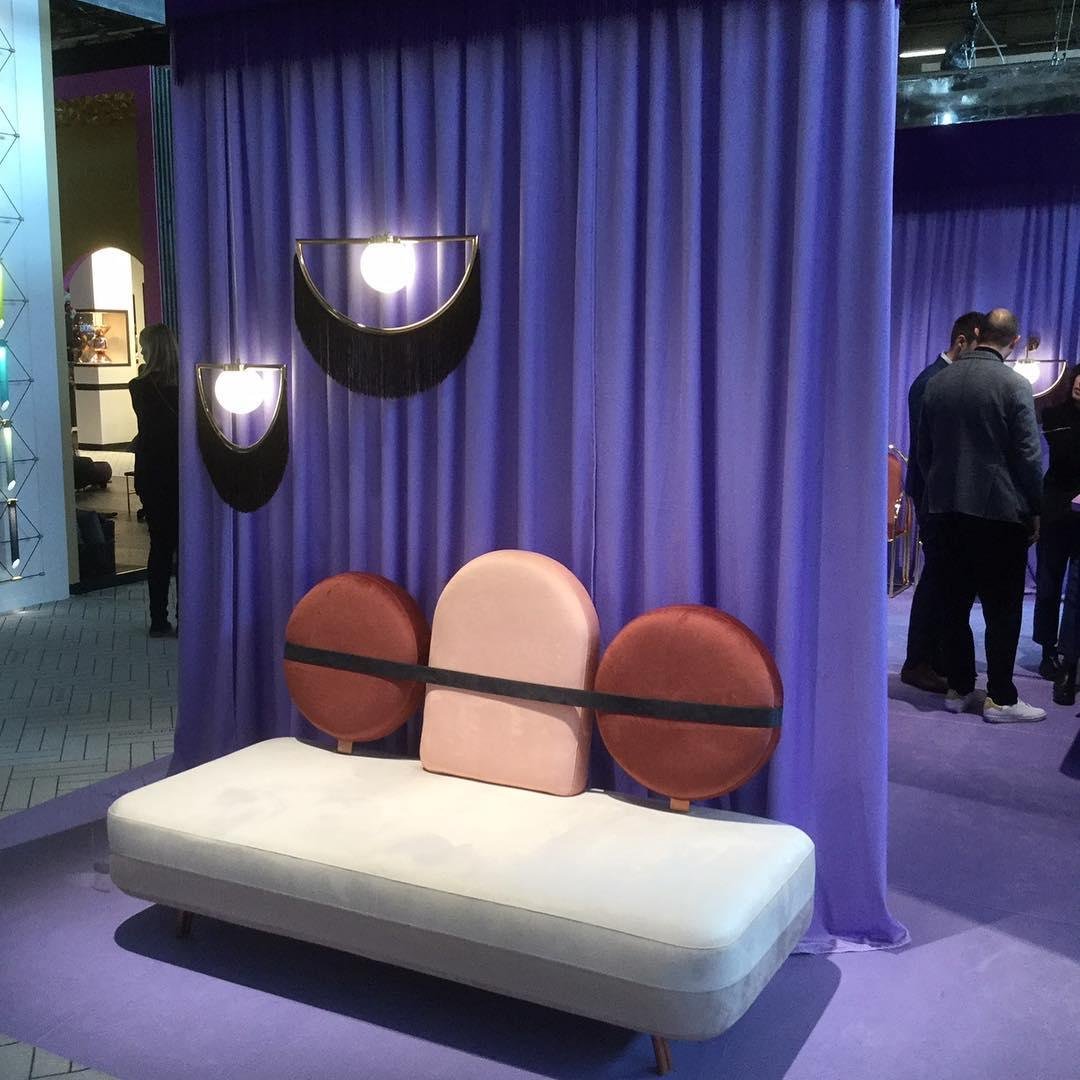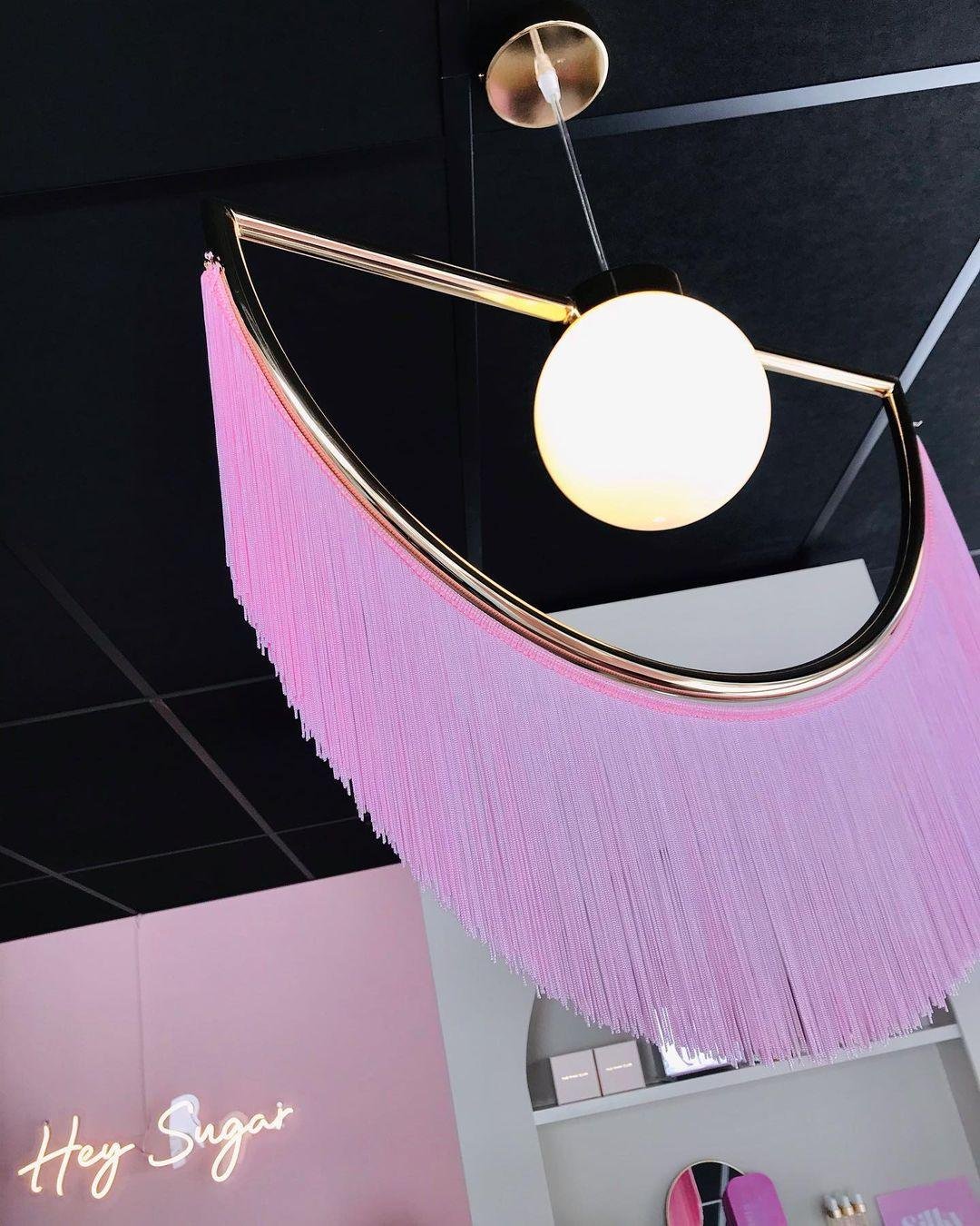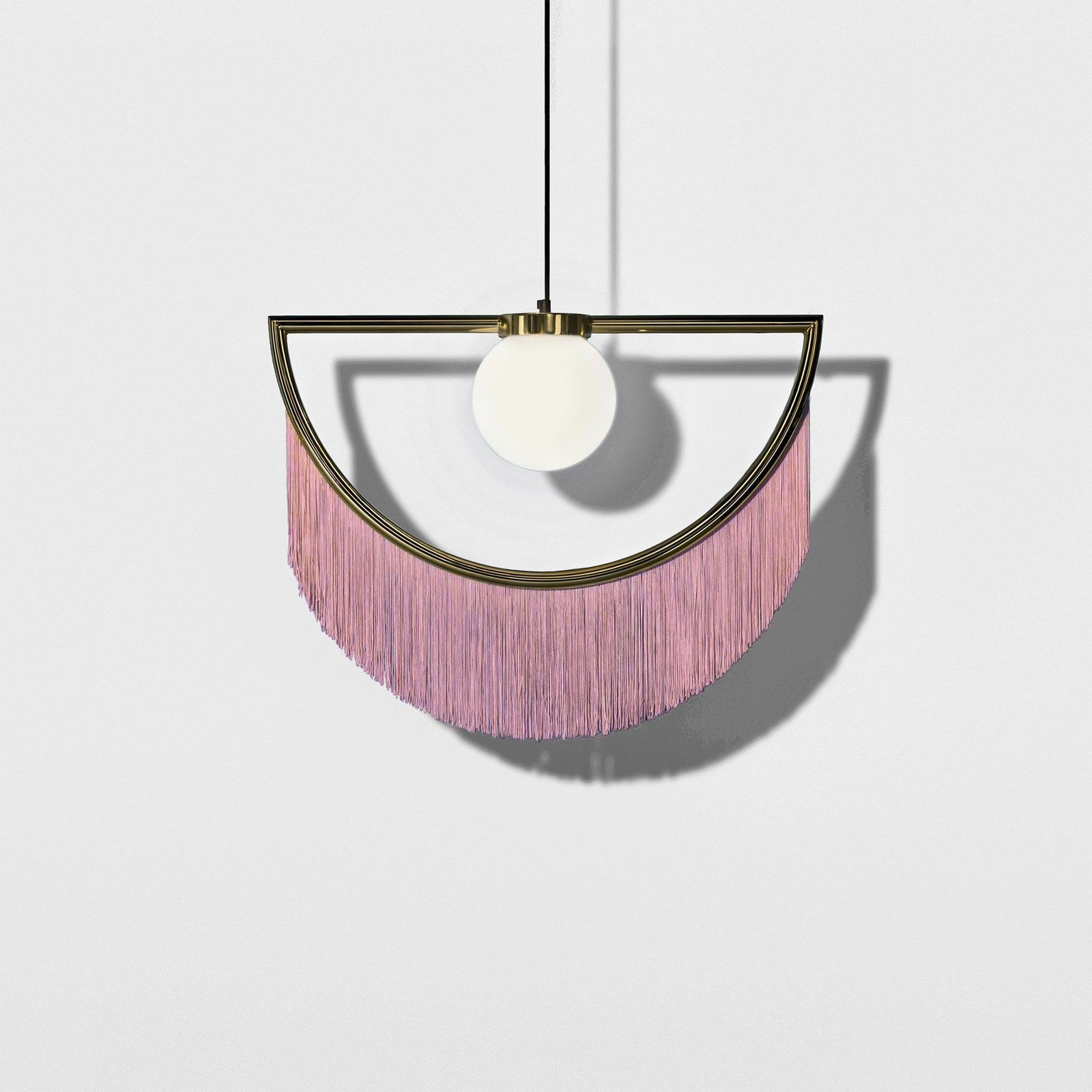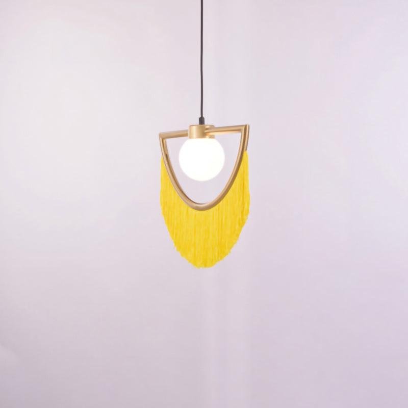 The Wink Pendant Light features a distinctive geometric design inspired by post-modern aesthetics. Its structure is shaped like an eye, combining a rigid gold metal frame with delicate, colorful fabric fringes. This fixture offers a sophisticated balance between modern lines and classic boudoir-style elements, making it a focal point for interior spaces. The light source is housed within a white glass globe, which diffuses light evenly for a soft ambient effect.