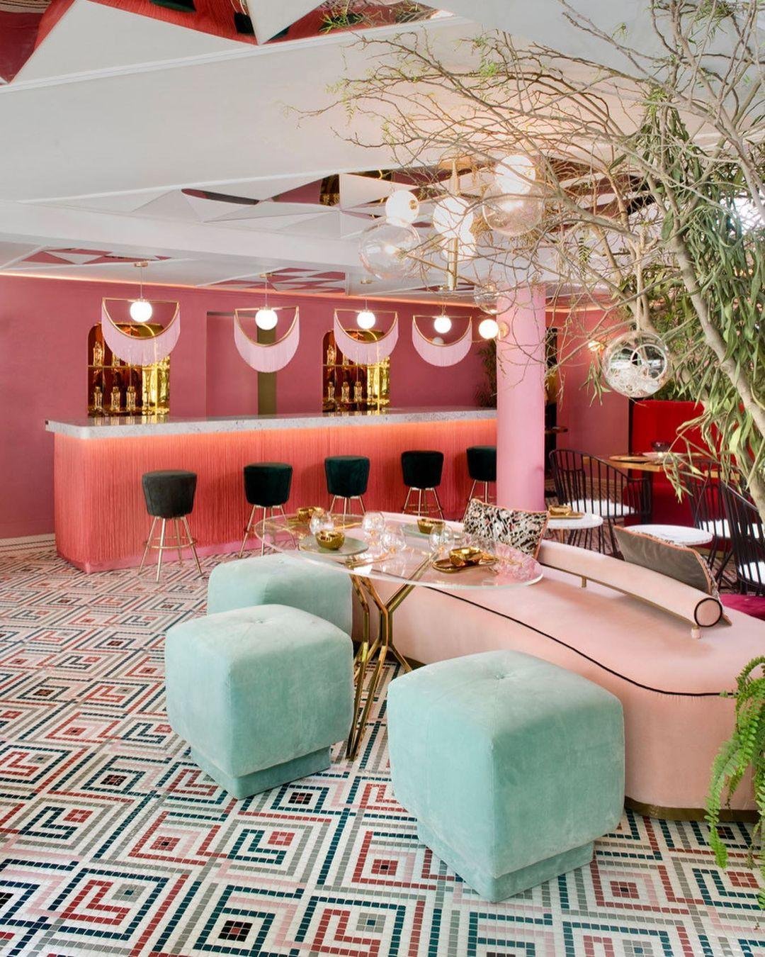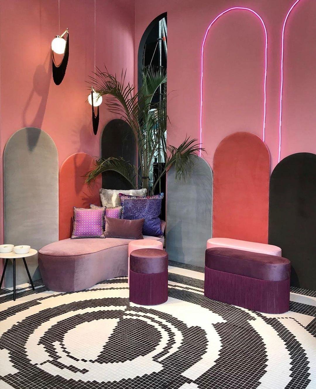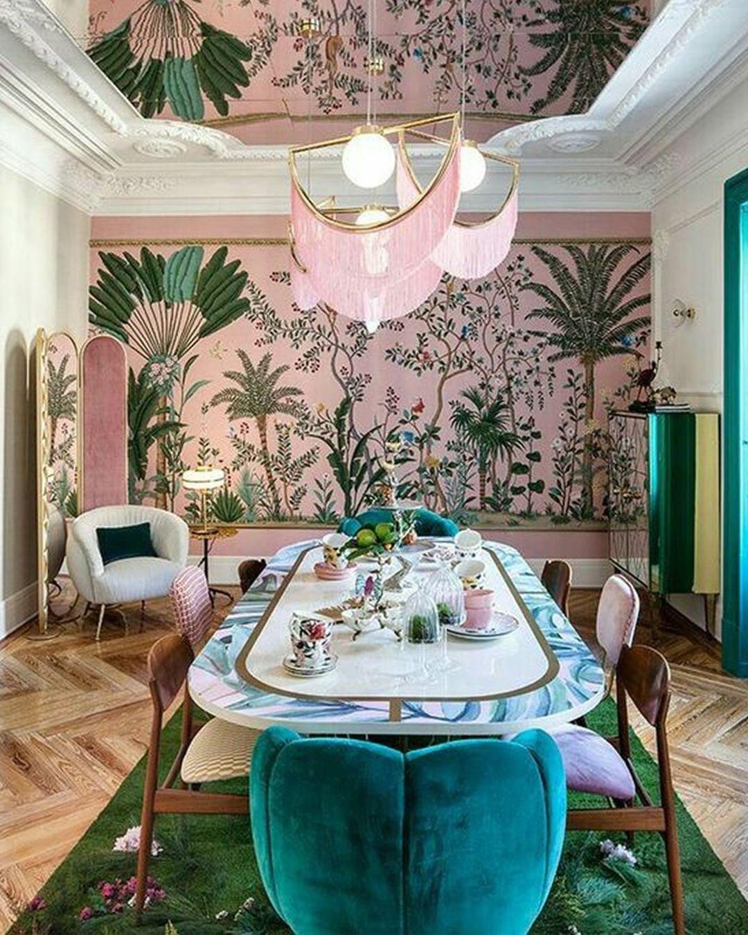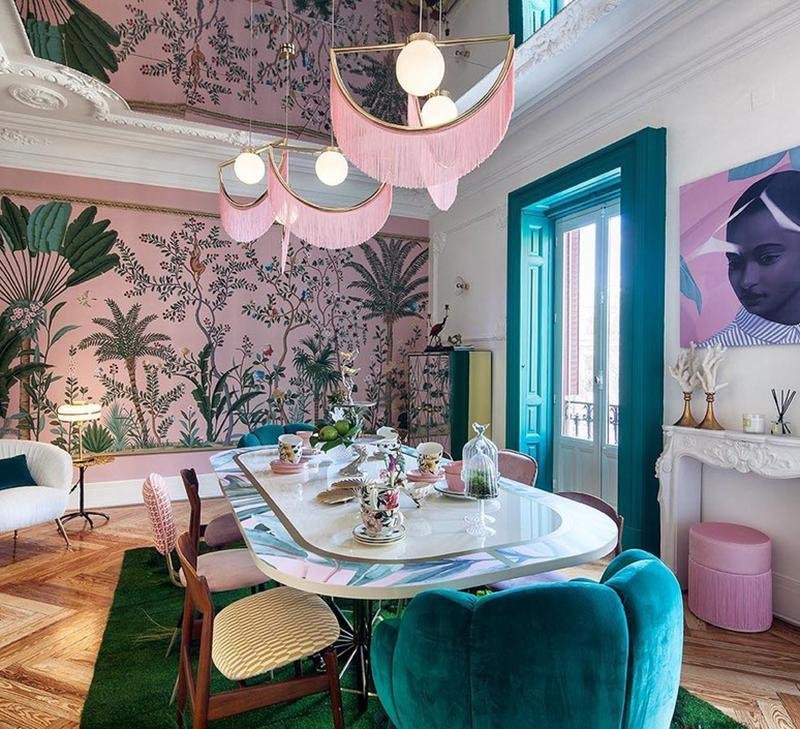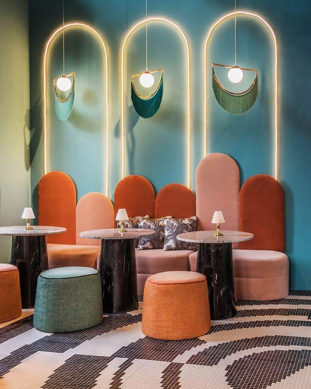 The Wink Pendant Light features a distinctive geometric design inspired by post-modern aesthetics. Its structure is shaped like an eye, combining a rigid gold metal frame with delicate, colorful fabric fringes. This fixture offers a sophisticated balance between modern lines and classic boudoir-style elements, making it a focal point for interior spaces. The light source is housed within a white glass globe, which diffuses light evenly for a soft ambient effect.