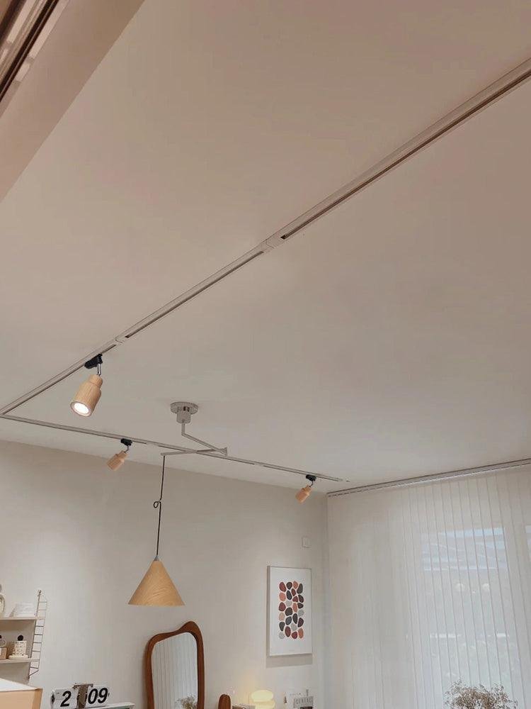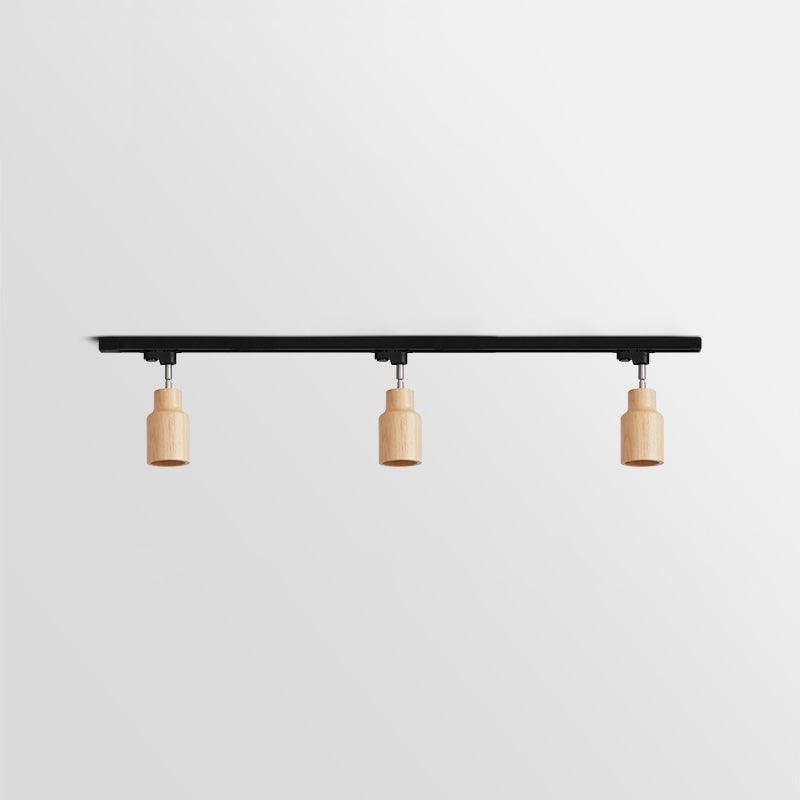 This modern industrial steel track fixture features adjustable light heads, allowing for directed illumination. A wood canopy complements the steel construction. This fixture can be installed as either a ceiling or wall-mount lamp, providing a versatile lighting solution.